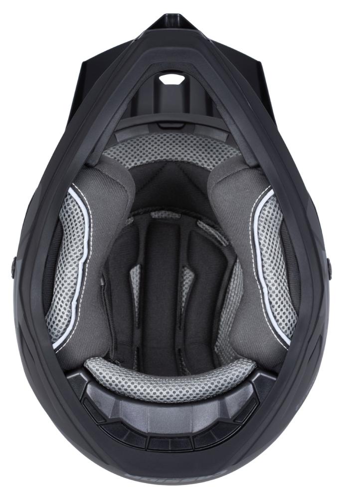 Čo sa týka vnútornej výstelky, tá je plne vyberateľná a prateľná, čo je významná výhoda pre rodičov, ktorí chcú udržať prilbu hygienicky čistú a príjemnú pre detskú pokožku. Polyesterový materiál je komfortný a zároveň odolný proti opotrebeniu. Sieťované panely sú strategicky umiestnené na prilbe tak, aby podporili cirkuláciu vzduchu a zlepšili odvetrávanie, čím predchádzajú nadmernému prehrievaniu alebo poteniu počas jazdy na trati. Uhlíkový filter umiestnený v prednom nádychu napomáha filtrovať prachové častice a iné nečistoty, čím zlepšuje kvalitu dýchacieho vzduchu a zároveň zvyšuje komfort nosenia.