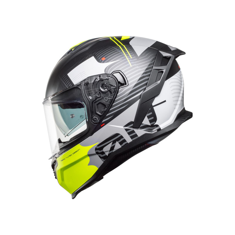 - mikrospojlery na prednej základni a deflektory na zadnej základni pre zníženie vibrácií prilby spôsobených turbulenciami vzduchu pri vysokej rýchlosti,